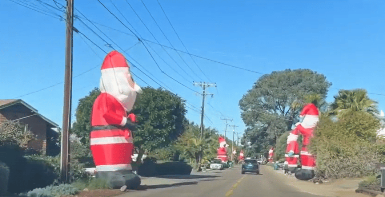 The display has weathered its share of challenges, from popped inflatables to a few that mysteriously disappeared, but neighbors always jump in with repairs, replacements, and extra Santas to keep the magic alive. It has become one of those sweet, only-in-Carlsbad moments where kids wander wide-eyed and parents chat along the sidewalk.